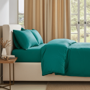 Lenjerie Damasc cu elastic 4 piese Valahia DX012 îmbină stilul modern cu funcționalitatea, oferind un somn odihnitor și un aspect rafinat camerei.