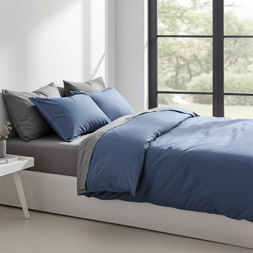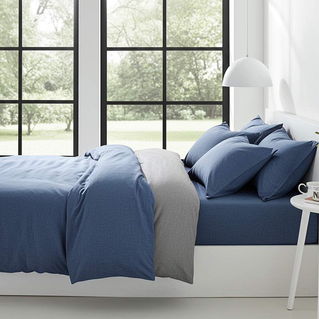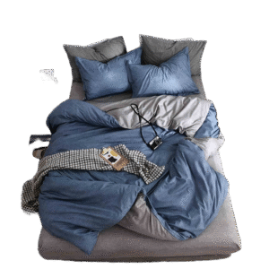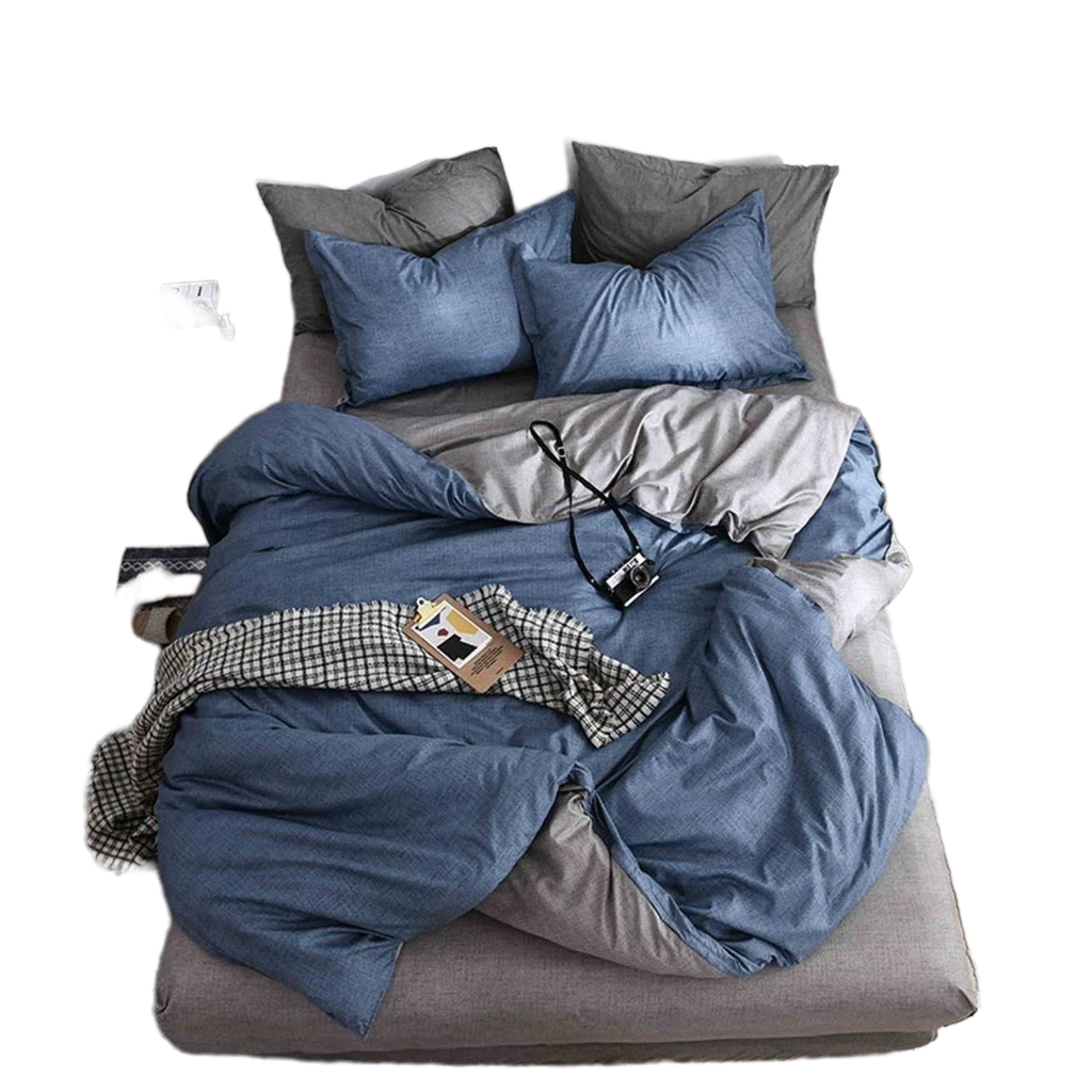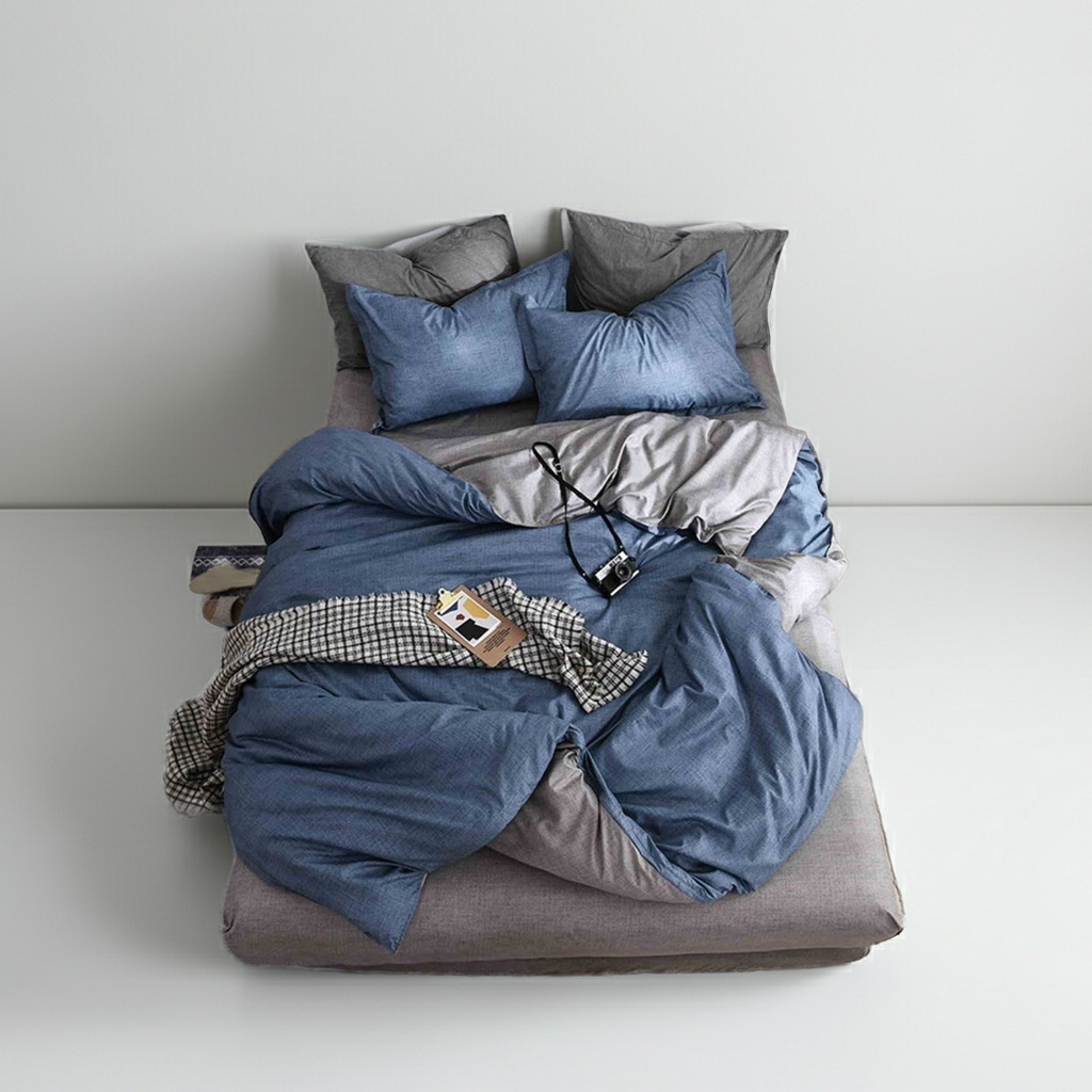 Lenjerie De Pat Kroos Xc086, Bumbac, 4 Piese, Cu Elastic, Albastru, Gri